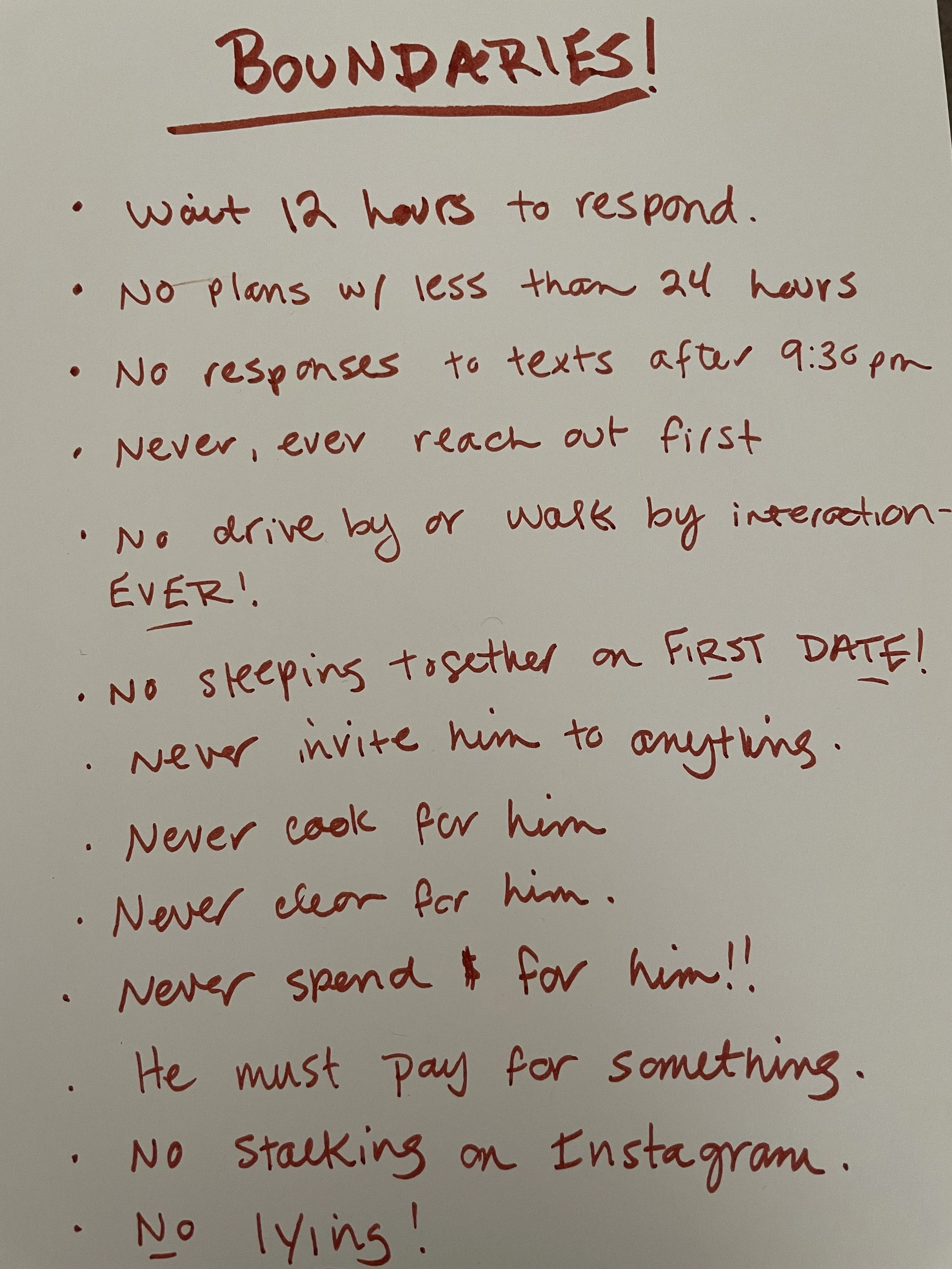 As a bonus, I’m also adding this gem I found in an old journal—written in BRIGHT RED PEN, in all caps, at a time when I was desperately trying to move on from someone who was objectively not good for me: “BOUNDARIES!” from 2015, which is giving unhinged clarity. (Good thing I told myself not to lie, not to clean, not to cook for him, and absolutely no drive-by or walk-by interactions—EVER!!!!!)